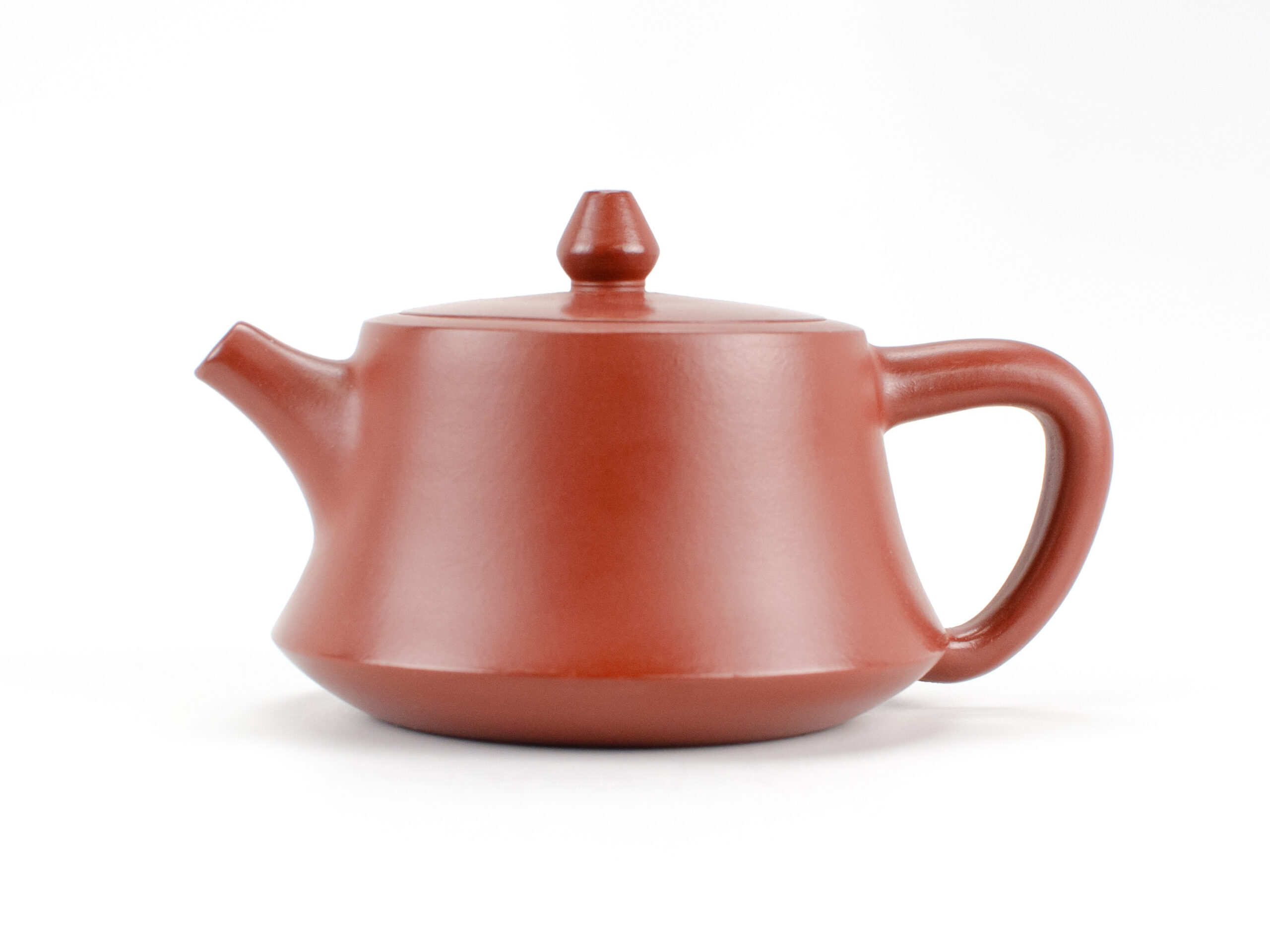 A minimalist columnar teapot with sheer sides, crisp corners, and a slightly fluted base, with a flat lid and conical lid knob. Its simple, smooth shape shows off the fine shine of its deep red Da Hong Pao clay.