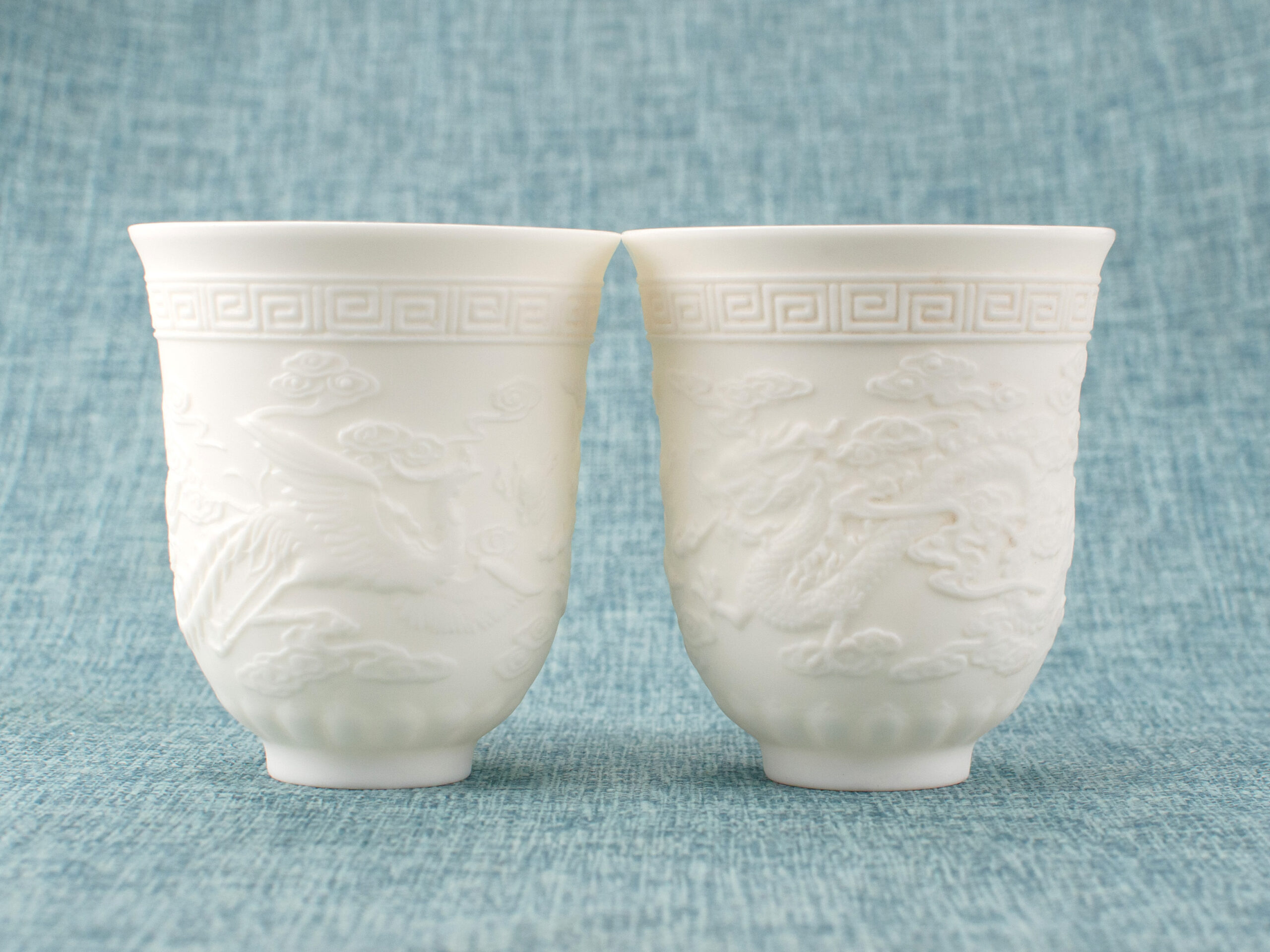 This sweeping tall white teacup is delicately relief-carved with a soaring dragon and phoenix pair around its sides. The classic imagery of these two legendary creatures historically were used to represent the emperor and empress, and as such dragon-and-phoenix themed gifts are often given as wedding presents.