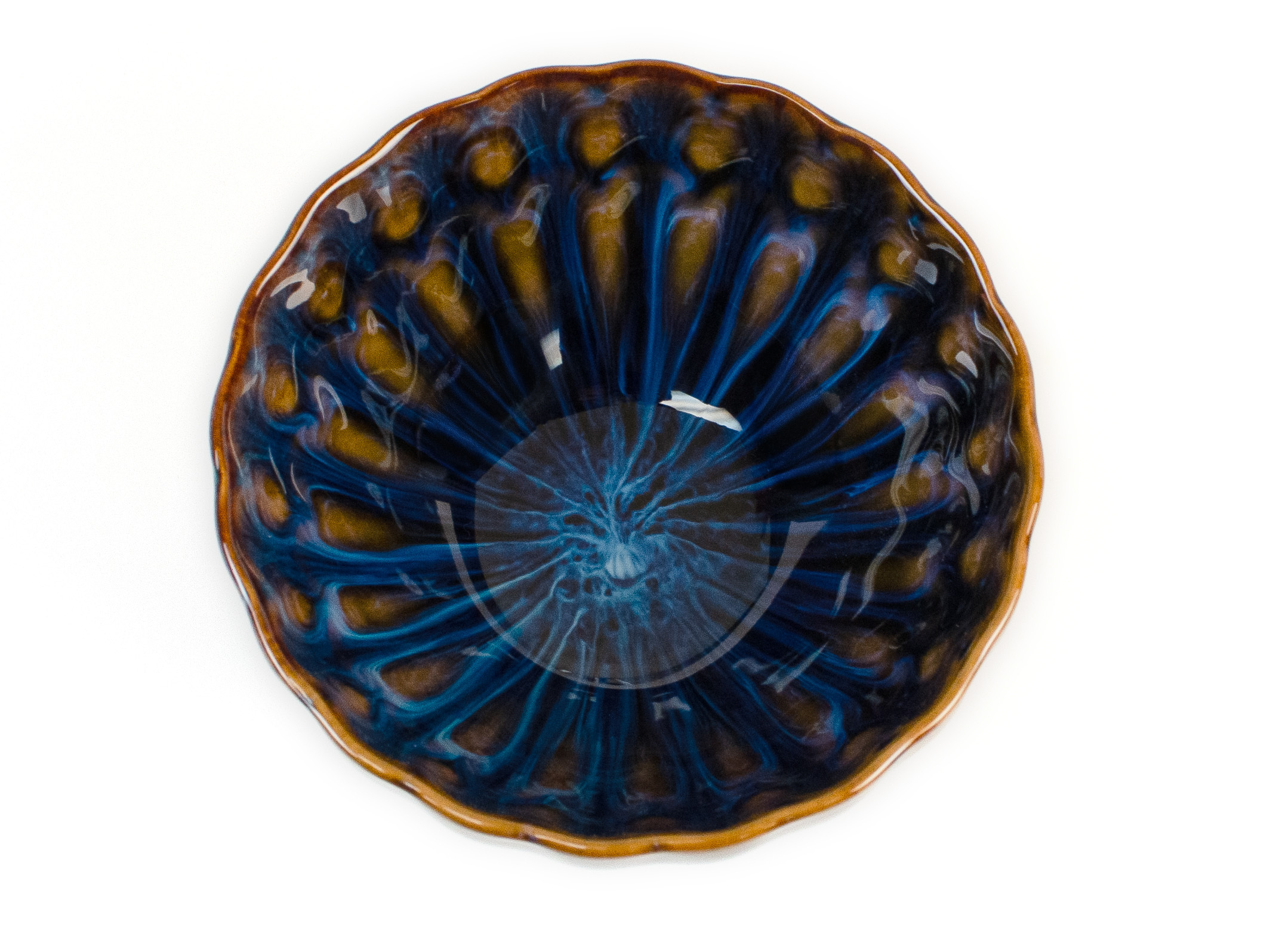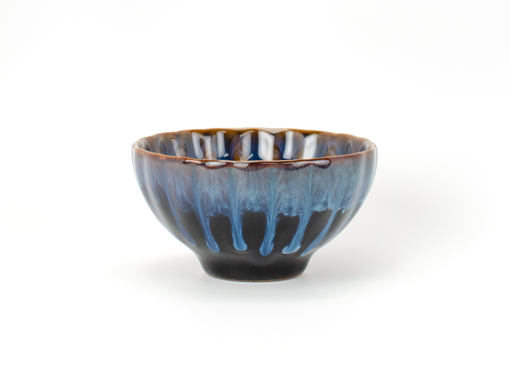 A striking teacup dappled in brilliant blue-and-brown glazes after the style of Jun Kiln ceramic wares. The textured walls of the cup have been lightly depressed into the long shape of chrysanthemum petals, giving the teacup the appearance of an open flower. A perfect distinctive personal teacup, each with a unique glaze pattern that develops in the kiln.